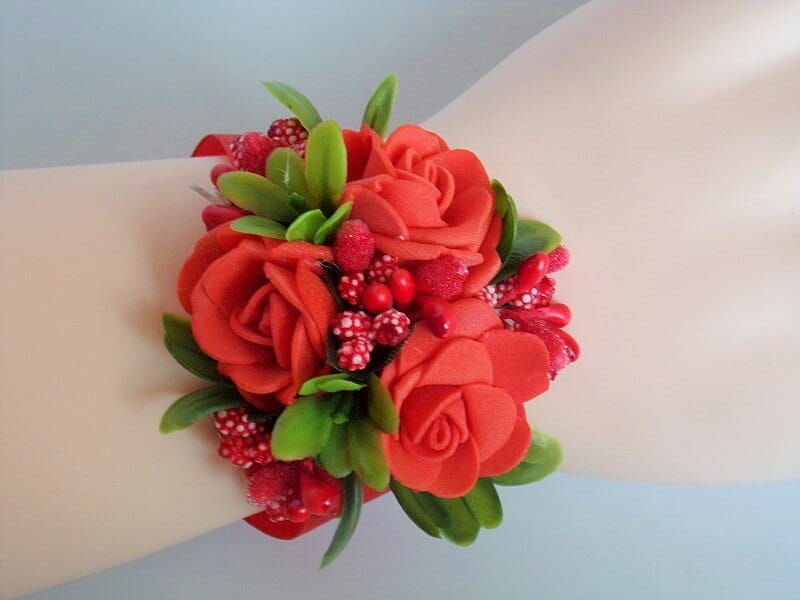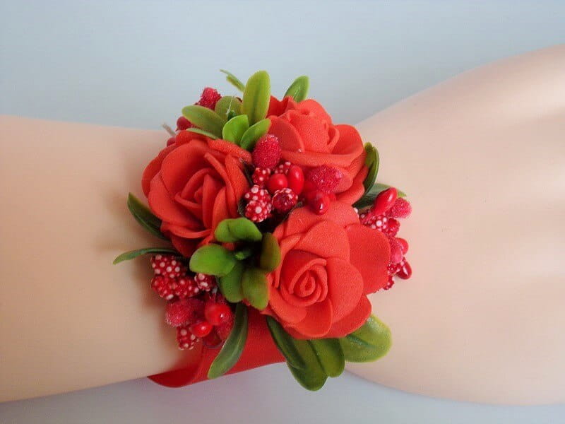 Kotylion, bukiecik na rękę wykonany jest z piankowych róż, zielonych listków i dodatków florystycznych.
