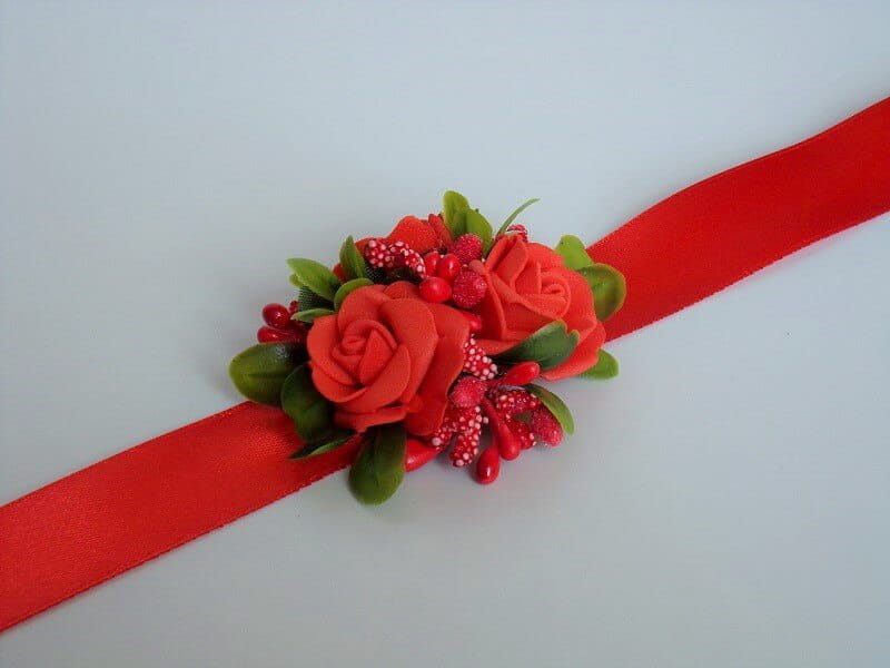 Na rękę wiązany jest za pomocą czerwonej satynowej tasiemki o szerokości 25mm i długości ok. 40cm.