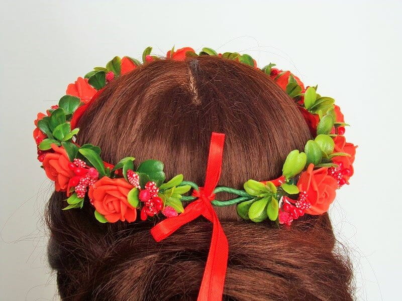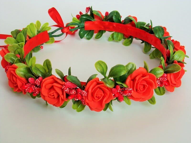 Wianek wykonany jest z piankowych róż, dodatków florystycznych, zielonych listków i wstążki.
