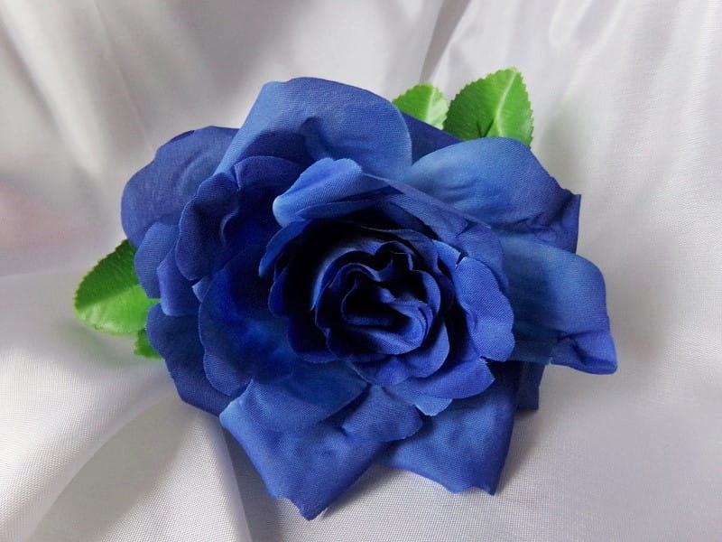 Dekoracja wykonana jest z jednej róży o średnicy ok. 11cm, zielonych listków, ratanu i przyssawek florystycznych.