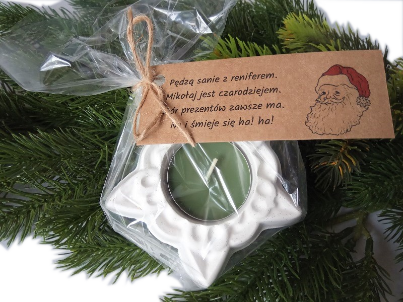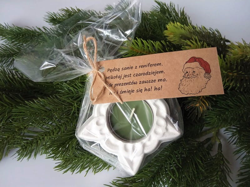 Gipsowy świecznik mieniący się srebrnym brokatem z tealightem zapakowany w celofanowy woreczek przewiązany sznureczkiem z bilecikiem.