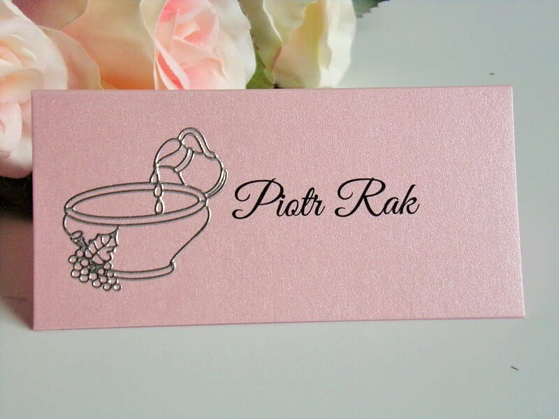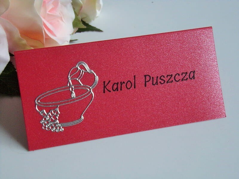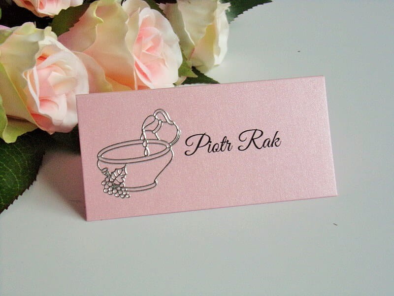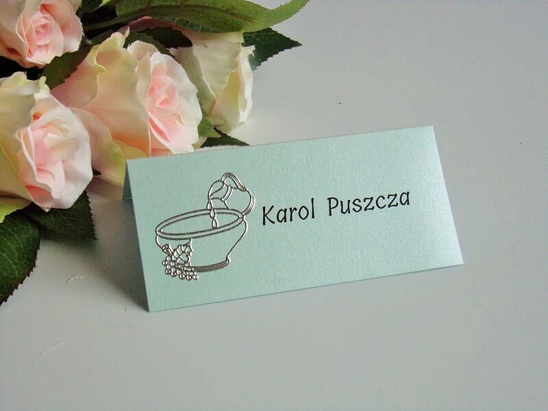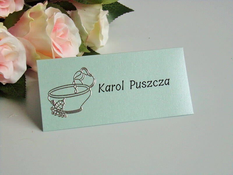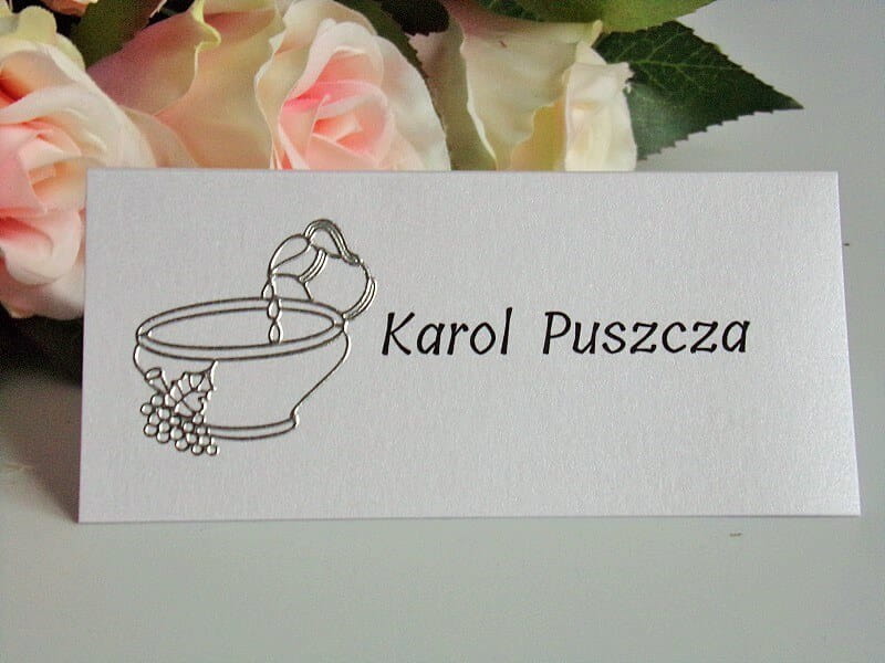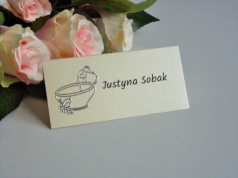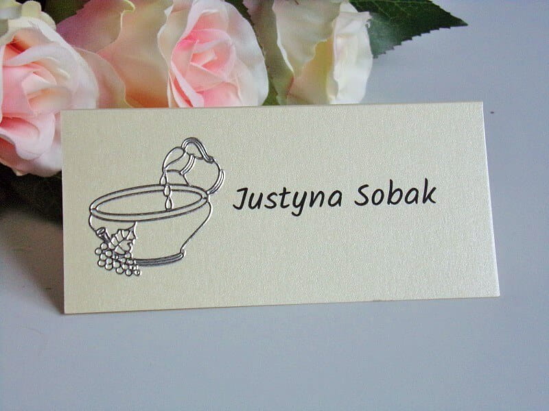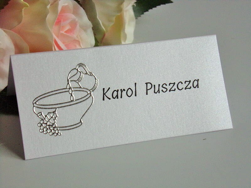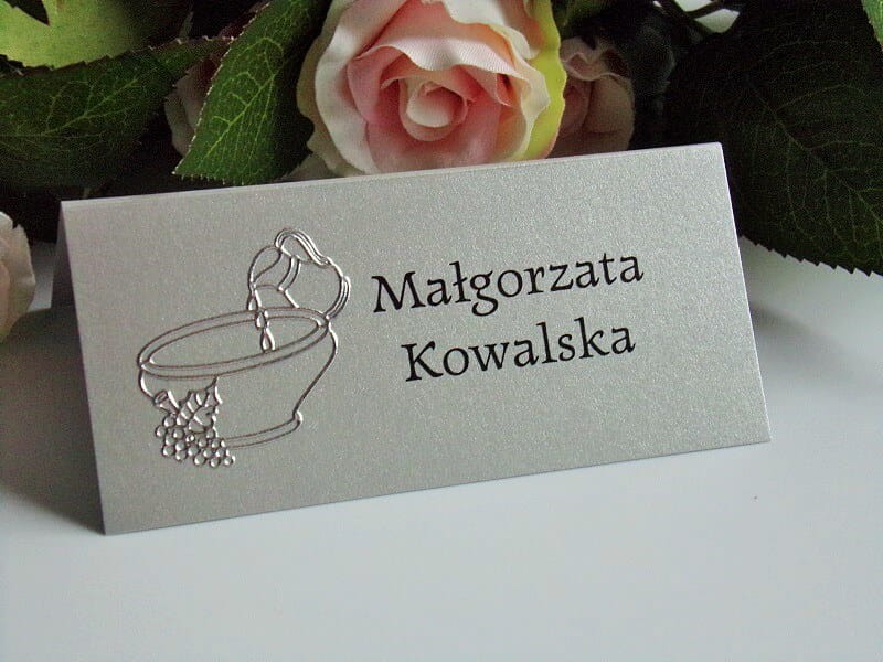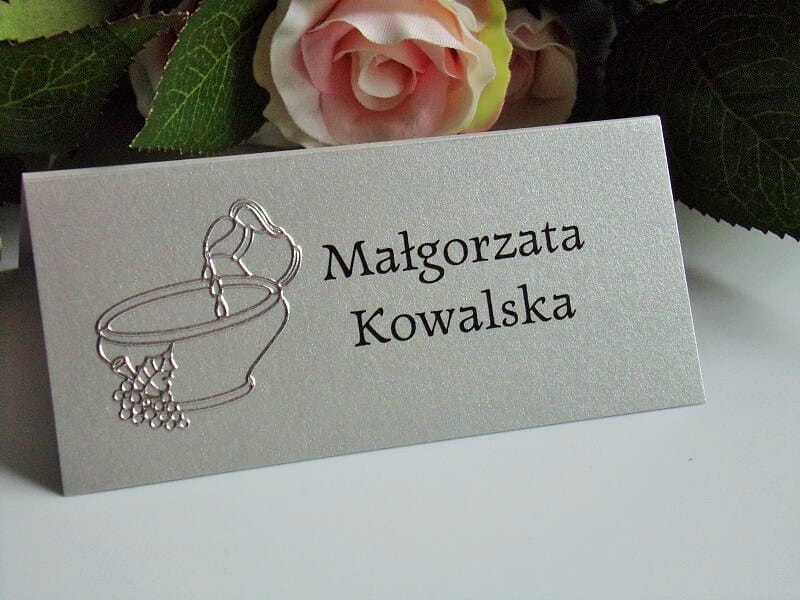 Winietka wykonana jest z papieru perłowego. Zdobi ją srebrna aplikacja.