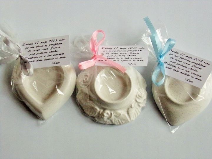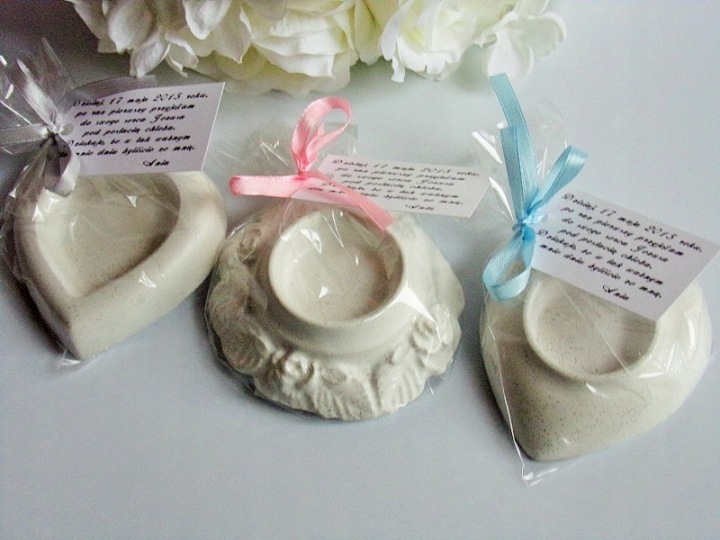Chcesz podziękować Gościom za udział w uroczystości Pierwszej Komunii Świętej, Chrztu Świętego, ślubu - podaruj im upominek - gipsowe świeczniki mieniące się srebrnym brokatem.
