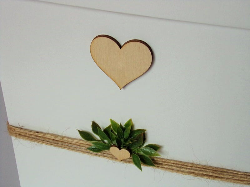 Dodatki - drewniane serduszka, napis, sztuczne rośliny, sznurek.