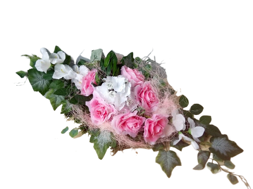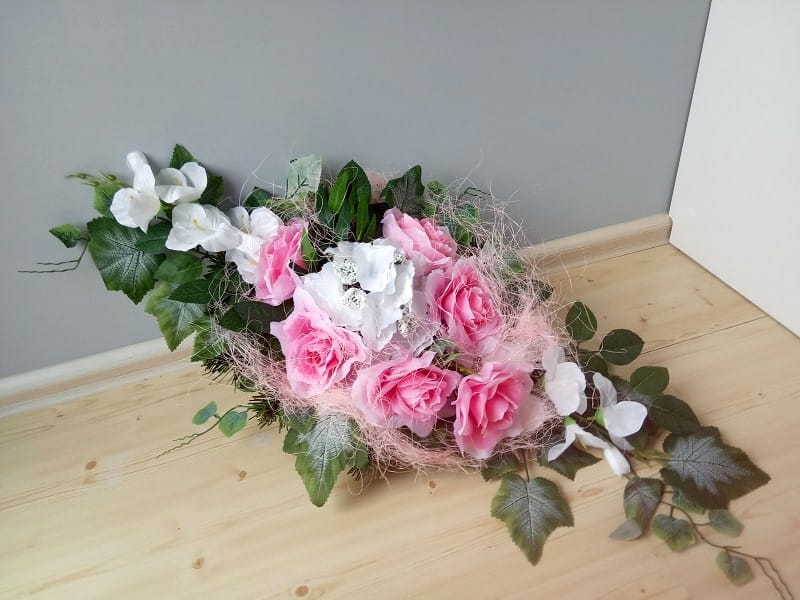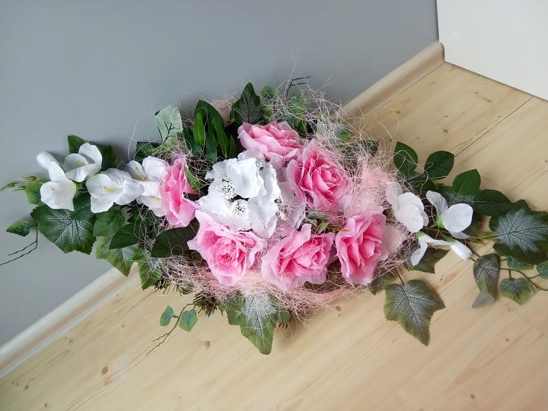 Stroik na płytę wykonany jest ze sztucznych kwiatów, liści, dodatków florystycznych.