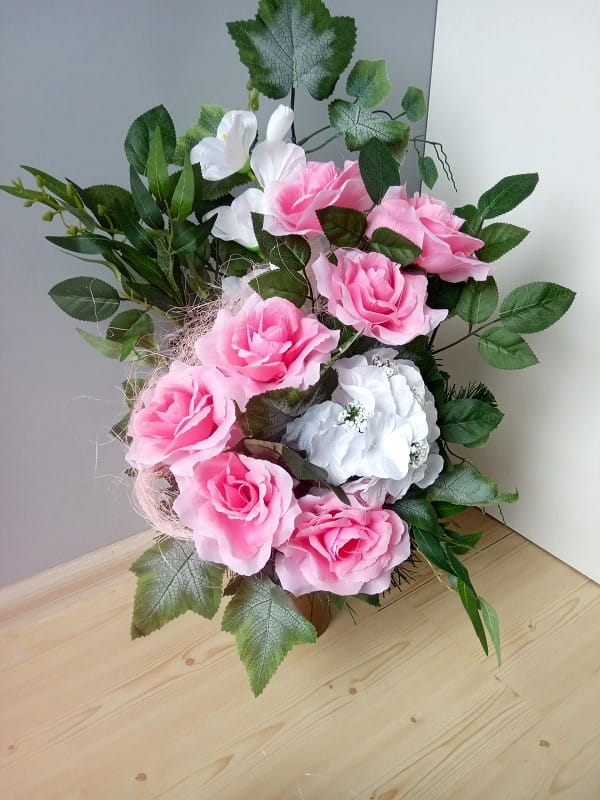 Bukiet do wazonu wykonany jest ze sztucznych kwiatów, liści i dodatków florystycznych. Wszystko umieszczone jest w podłużnej doniczce z tworzywa sztucznego, zalanej cementem. Dzięki czemu cała kompozycja jest stabilna.