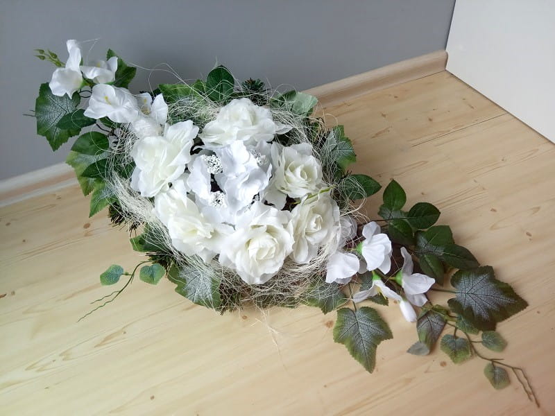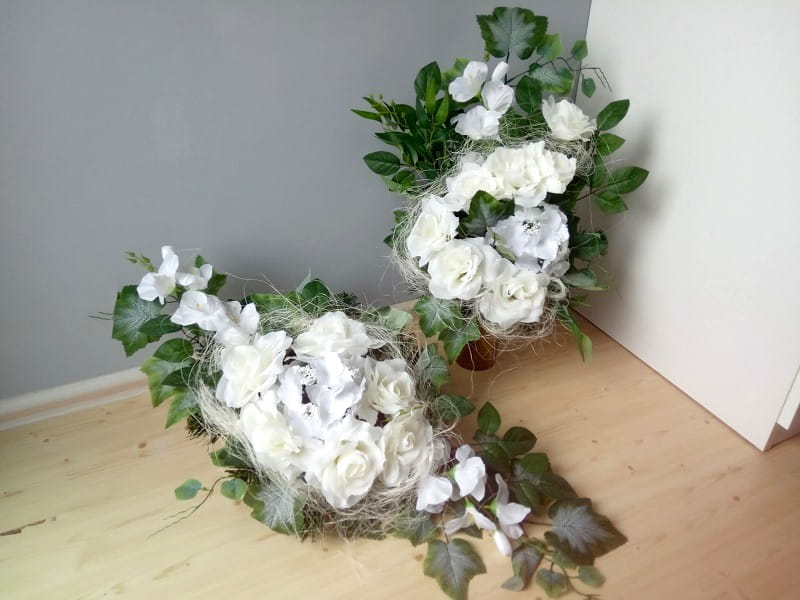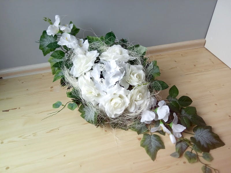 Bukiet do wazonu wykonany jest ze sztucznych kwiatów, liści i dodatków florystycznych. Wszystko umieszczone jest w podłużnej doniczce z tworzywa sztucznego, zalanej cementem. Dzięki czemu cała kompozycja jest stabilna.