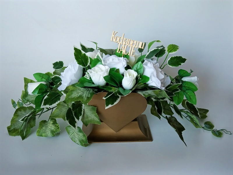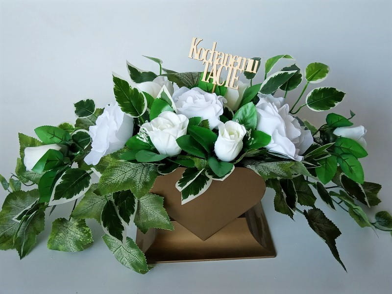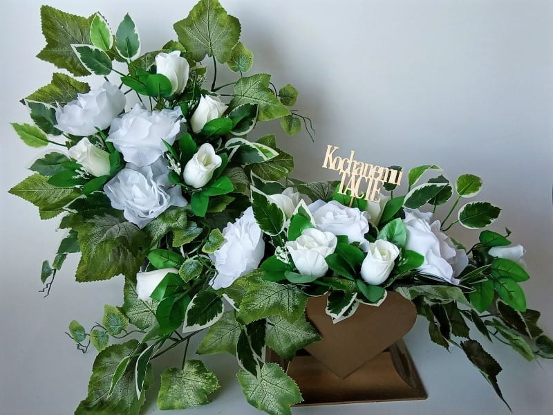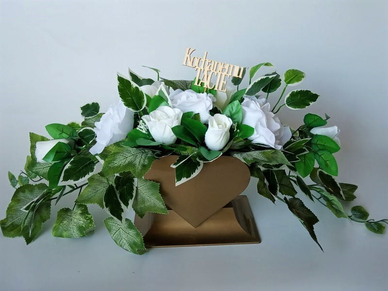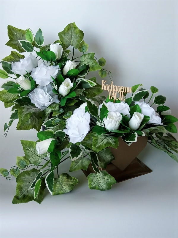 Stroik na płytę wykonany jest ze sztucznych kwiatów i liści. Wszystko umieszczone jest w doniczce z tworzywa sztucznego w kształcie serca, zalanej cementem. Dzięki czemu cała kompozycja jest stabilna i nie przesuwa się na płycie pod wpływem wiatru. Zdobi ją drewniany napis.