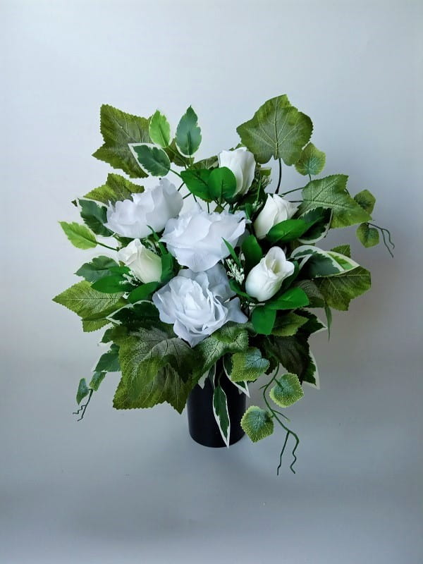 Bukiet do wazonu wykonany jest ze sztucznych kwiatów i liści. Wszystko umieszczone jest w podłużnej doniczce z tworzywa sztucznego, zalanej cementem. Dzięki czemu cała kompozycja jest stabilna.