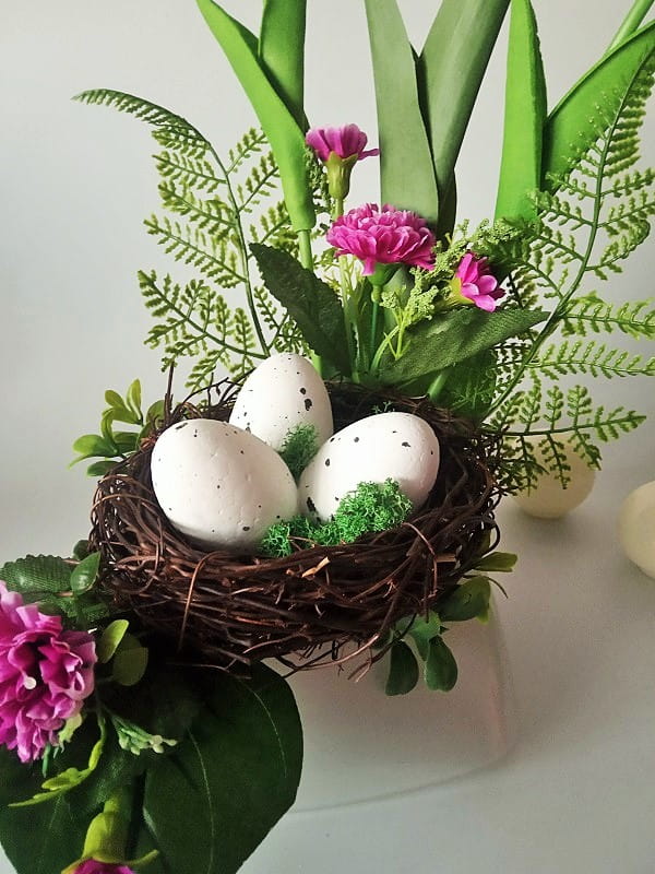 Dekoracja wykonana jest ze sztucznych kwiatów, silikonowych tulipanów, zielonych listków, traw, dodatków florystycznych i styropianowych jajeczek.