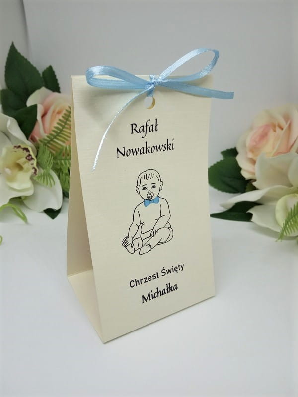 - wysyłane w formie rozłożonej (należy zgiąć wzdłuż bigu, umieścić w środku podarek i zawiązać tasiemkę)