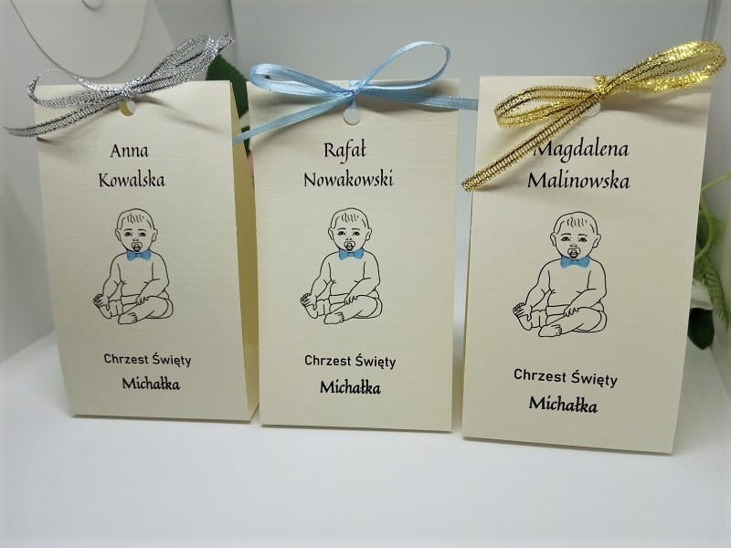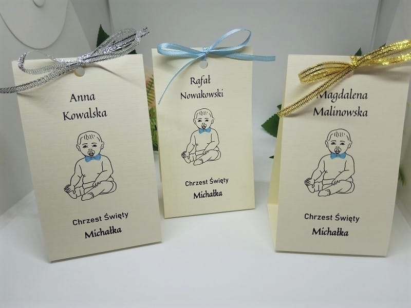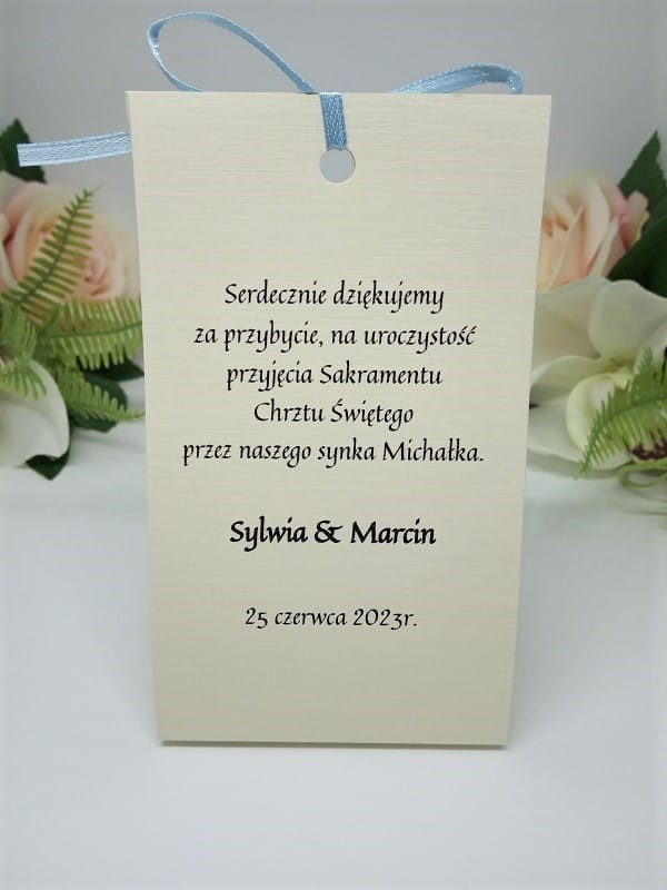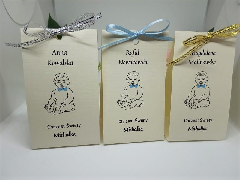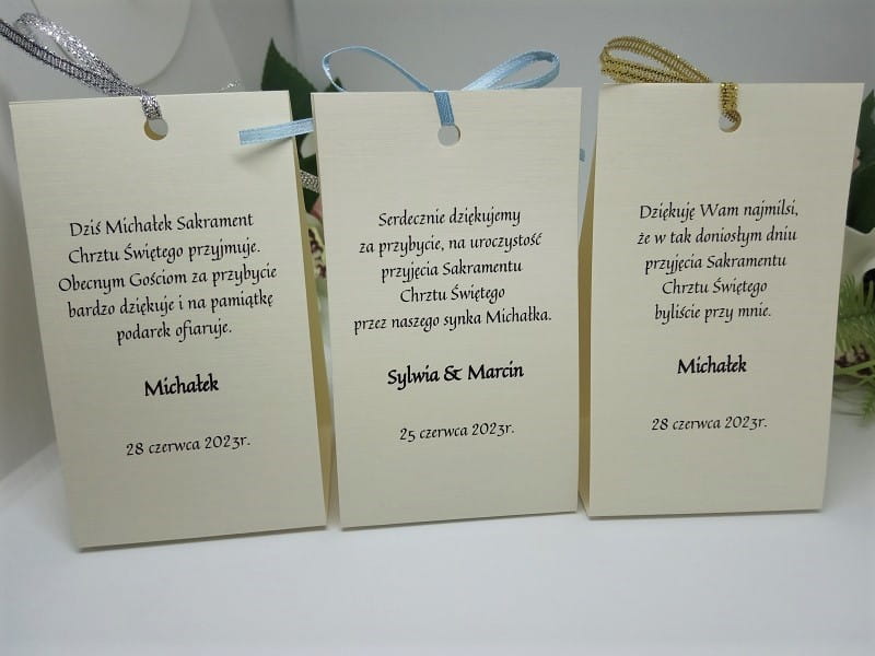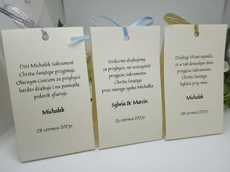 - na jednej stronie wydrukowane są dane gości, na drugiej podziękowanie za przybycie