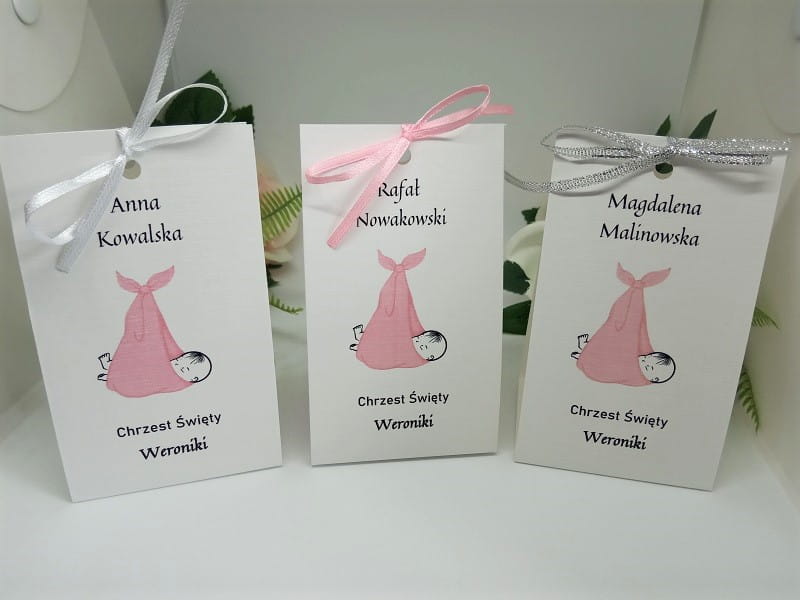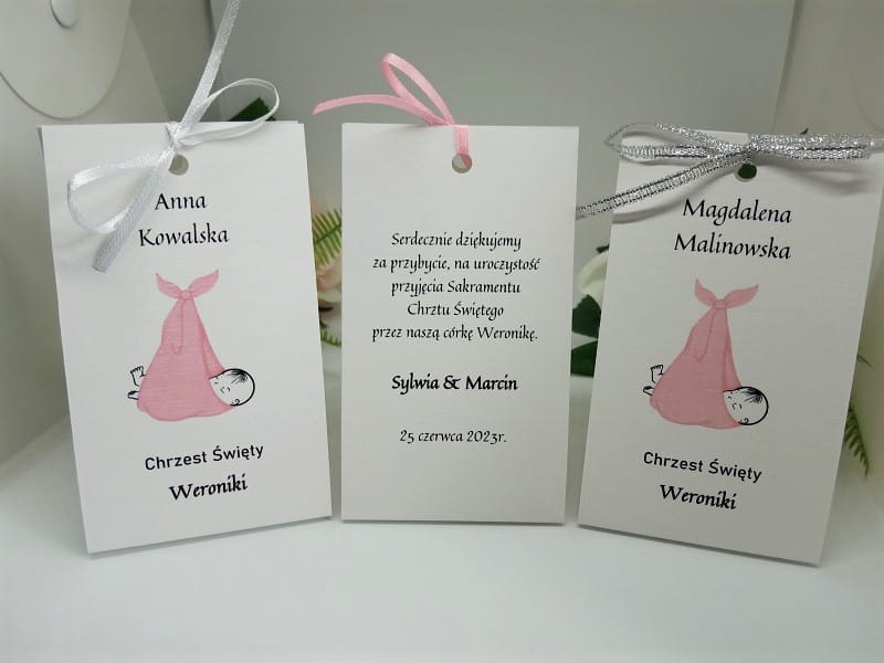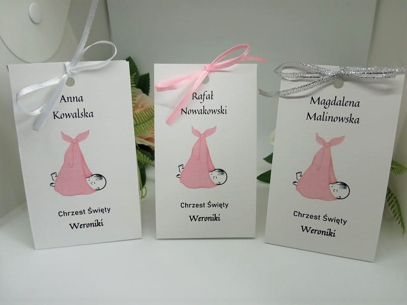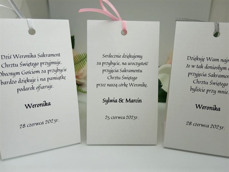 - na jednej stronie wydrukowane są dane gości, na drugiej podziękowanie za przybycie