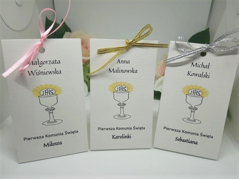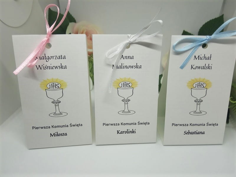 - na jednej stronie wydrukowane są dane gości, na drugiej podziękowanie za przybycie