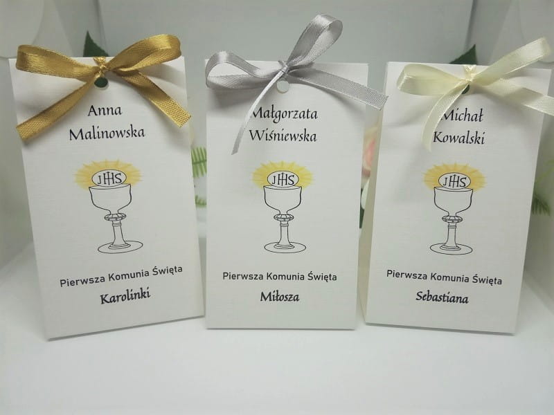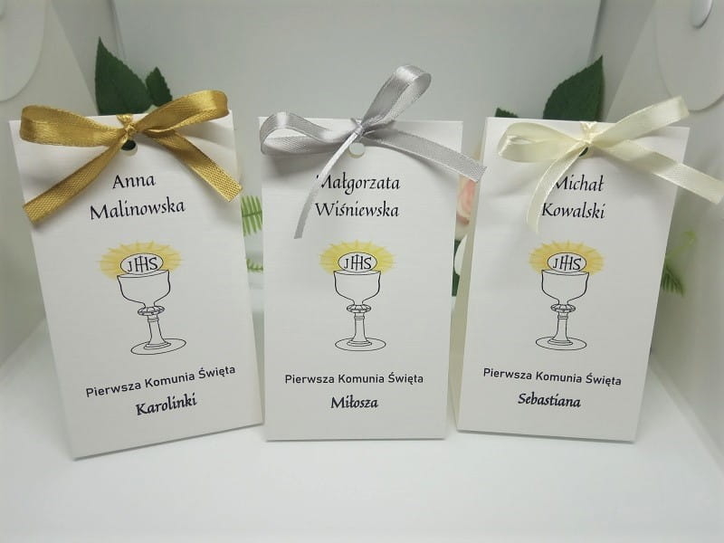 - na jednej stronie wydrukowane są dane gości, na drugiej podziękowanie za przybycie