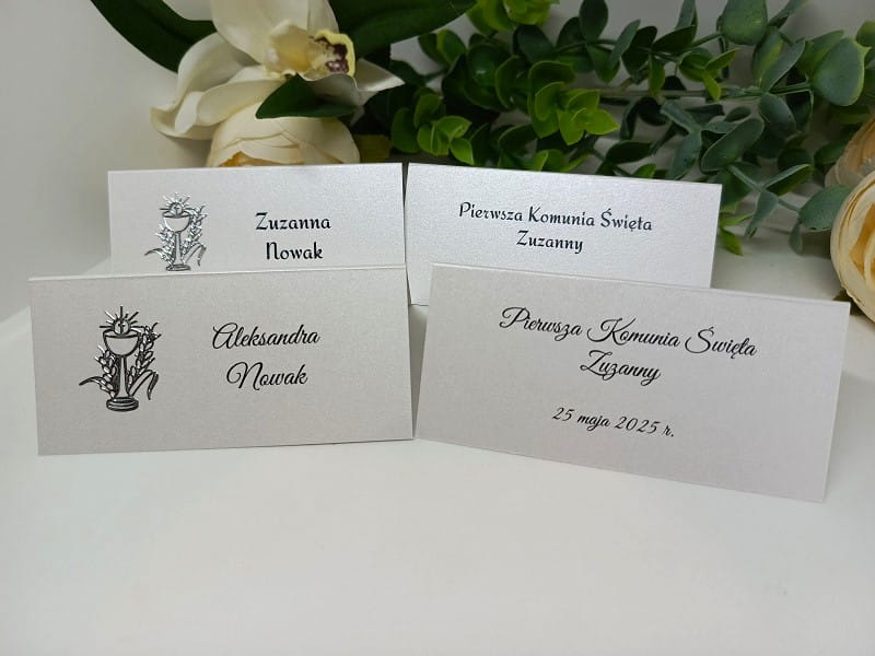- Na jednej stronie winietki wydrukowane są dane gości, a na drugiej stronie napis "Pierwsza Komunia Święta + imię dziecka + data uroczystości".