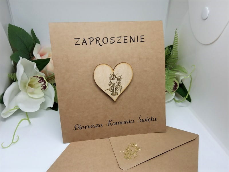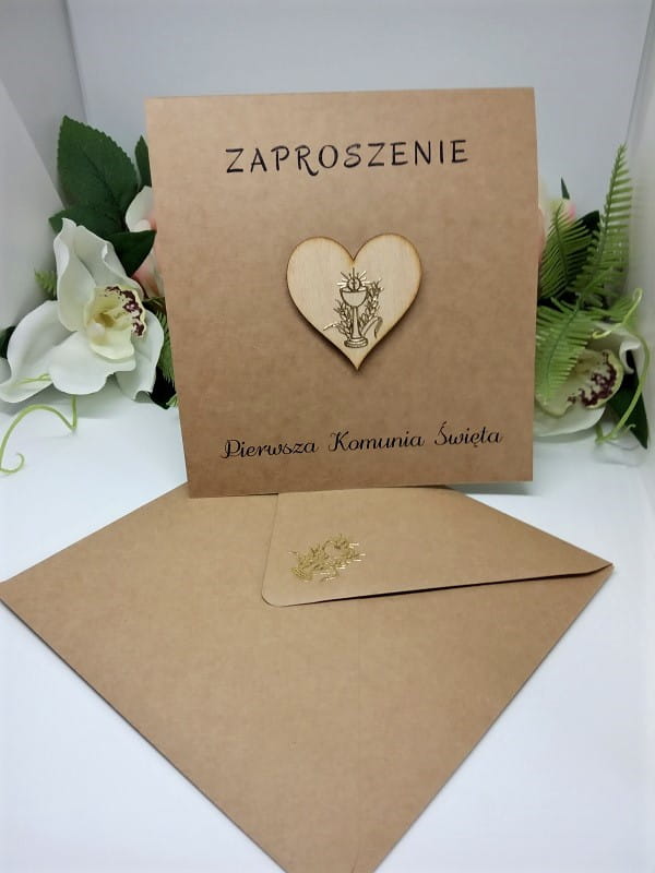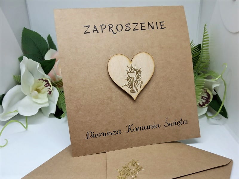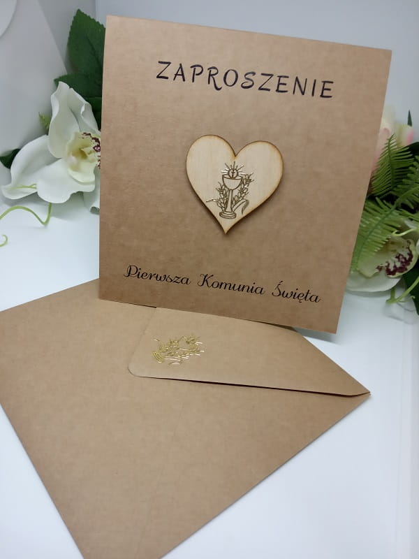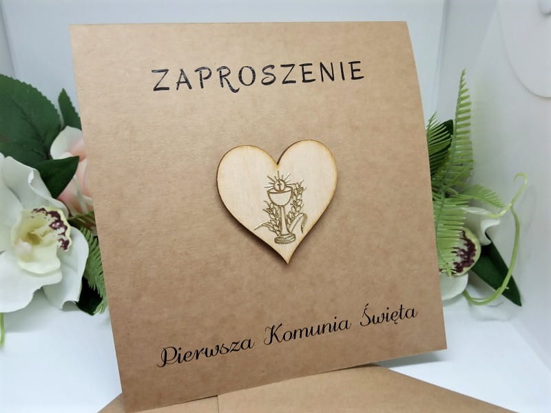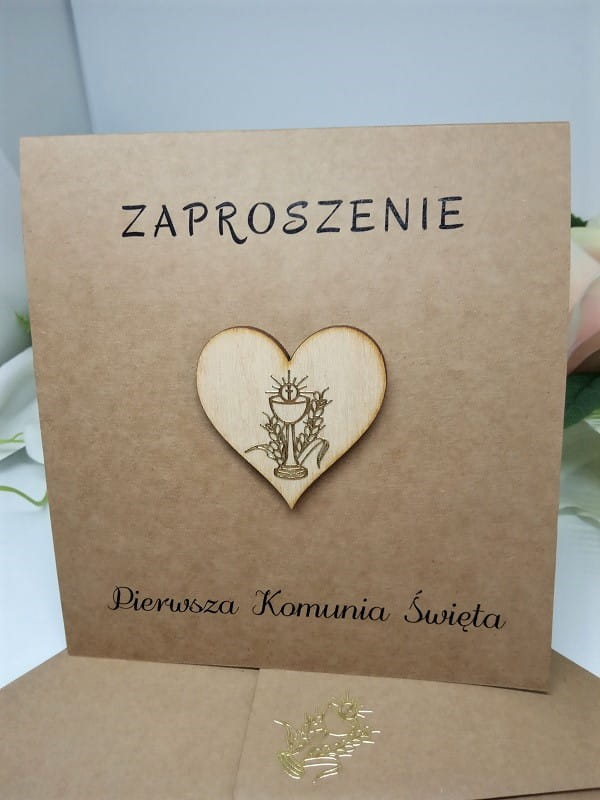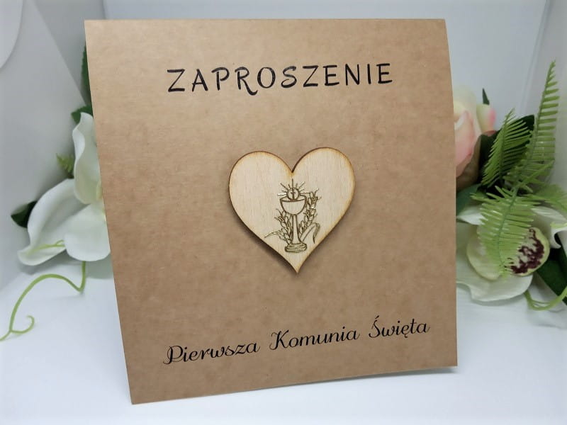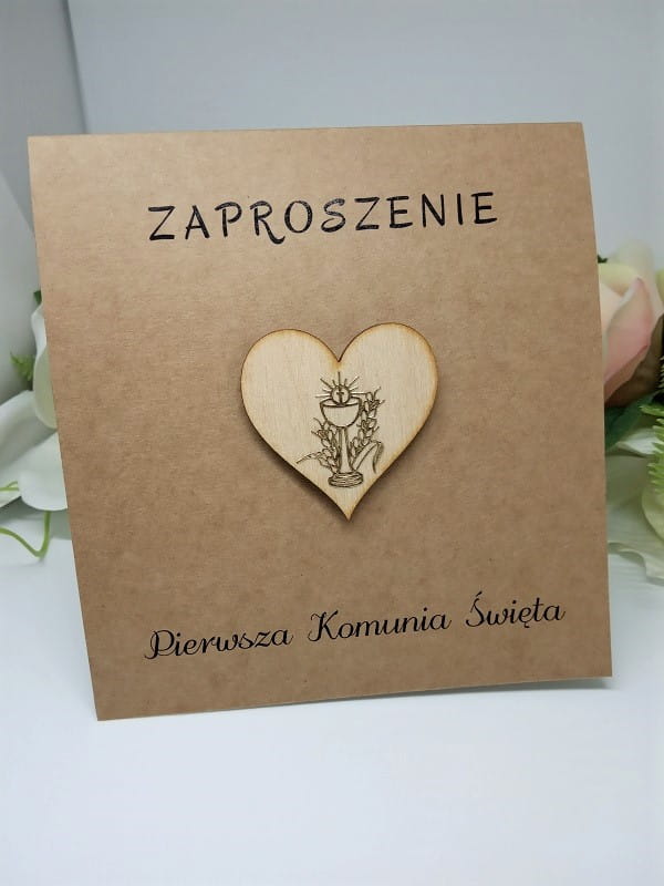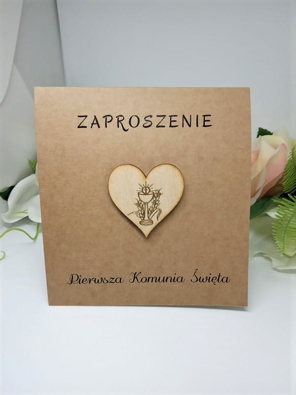 ZK27B * Zaproszenie na Pierwszą Komunię Świętą z drewnianym sercem i złotym kielichem