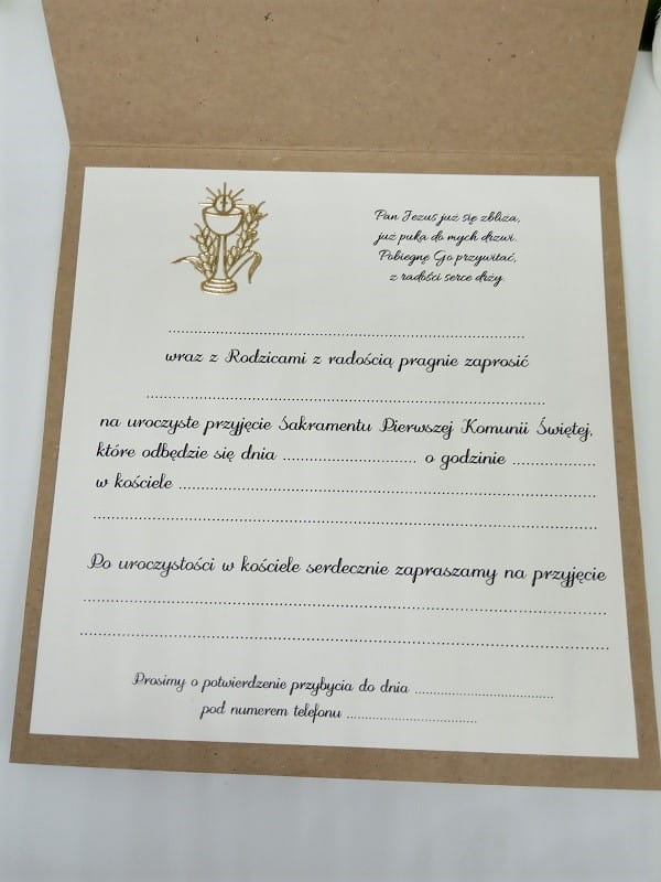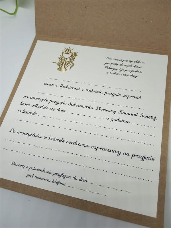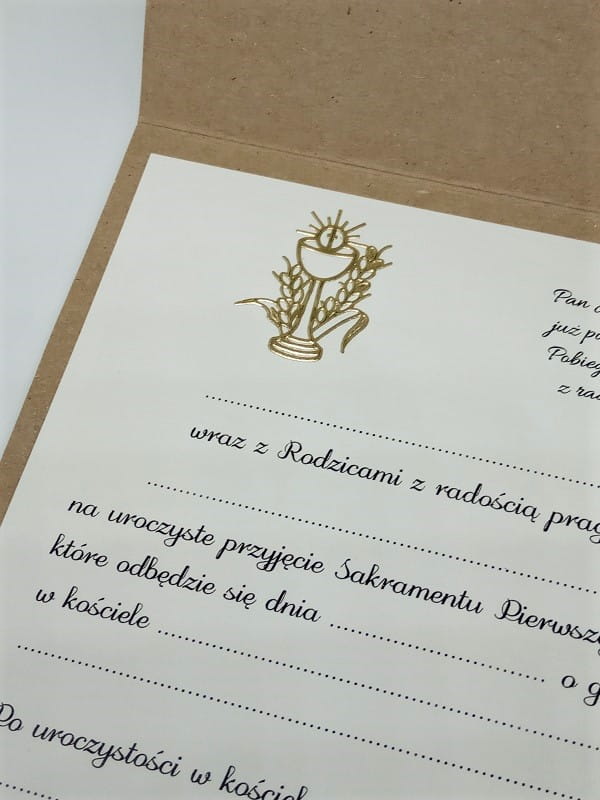 - W środku zaproszenia - tekst wydrukowany na papierze białym fakturowanym (tkanina lniana) o grubości 246g/m2 naklejony na papier ekologiczny ze złotym kielichem.