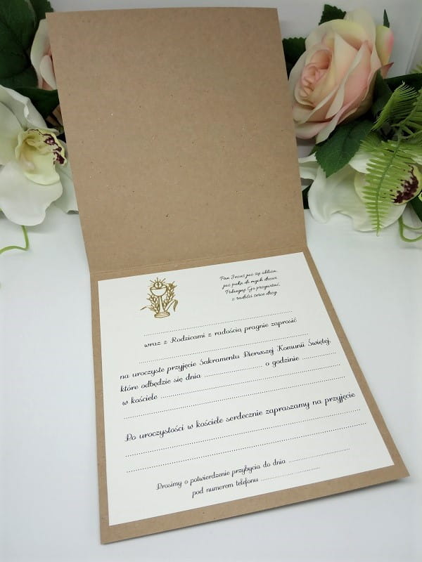 - Do zaproszenia dołączona jest ekologiczna, brązowo-szara koperta ozdobiona złotym kielichem.