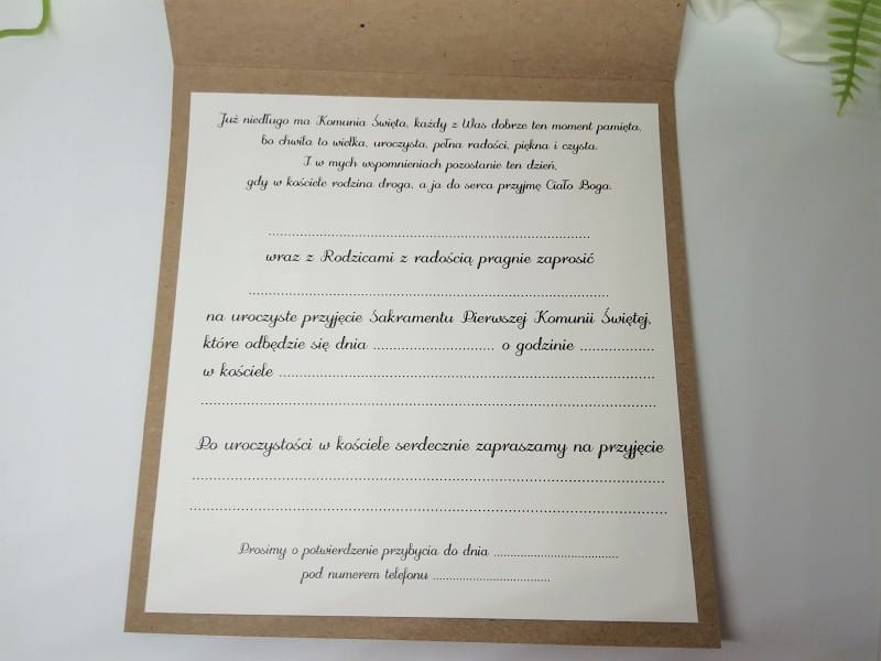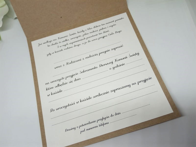 - Do zaproszenia dołączona jest ekologiczna, brązowo-szara koperta.