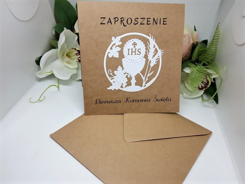 - Do zaproszenia dołączona jest ekologiczna, brązowo-szara koperta.