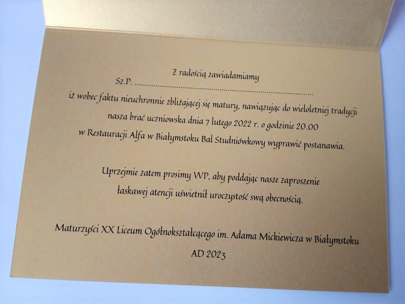 ZT5 * Złote zaproszenie na Studniówkę * spersonalizowane