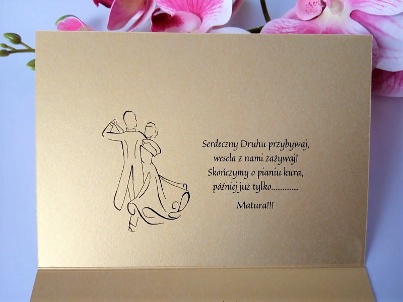 Zaproszenie wykonane jest na papierze perłowym, złotym o gramaturze 246g/m2.