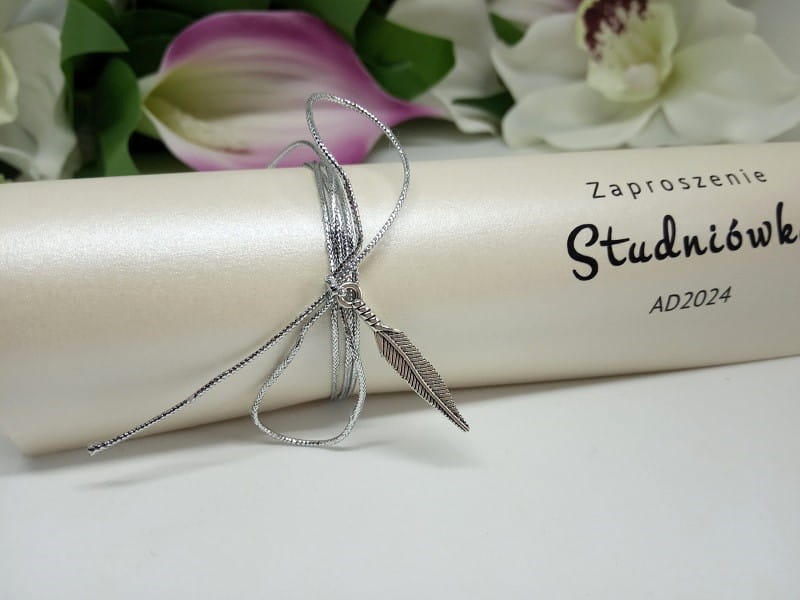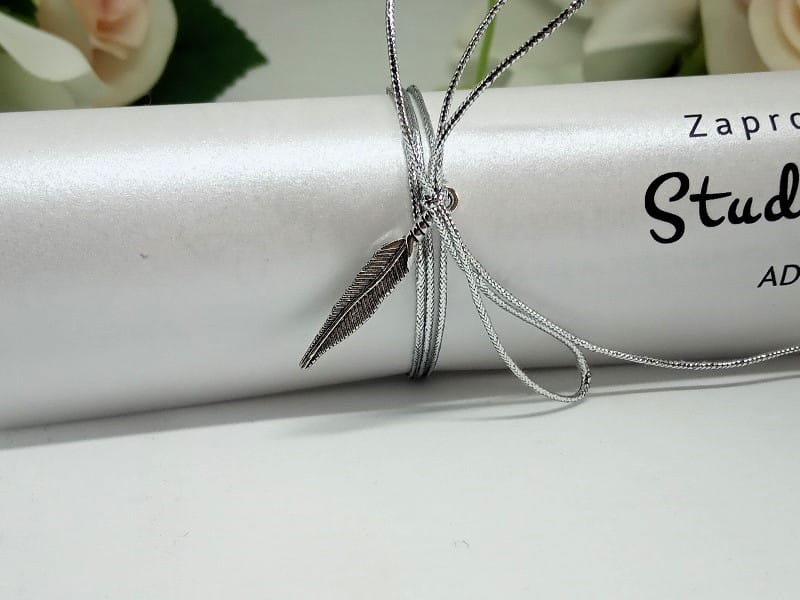 - Zaproszenie przewiązane jest sznureczkiem ze srebrnym piórkiem.