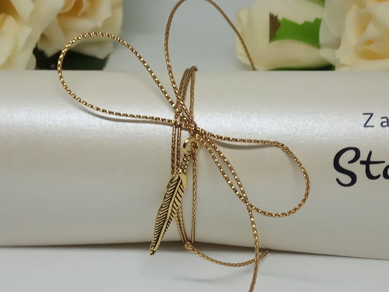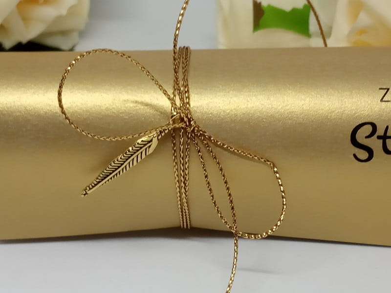 - Zaproszenie przewiązane jest sznureczkiem ze złotym piórkiem.