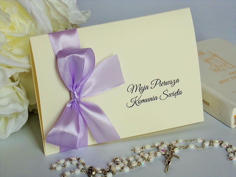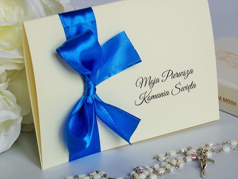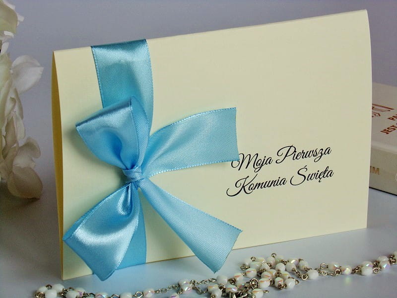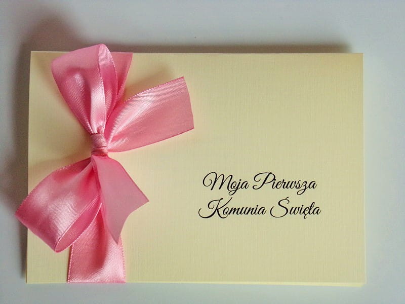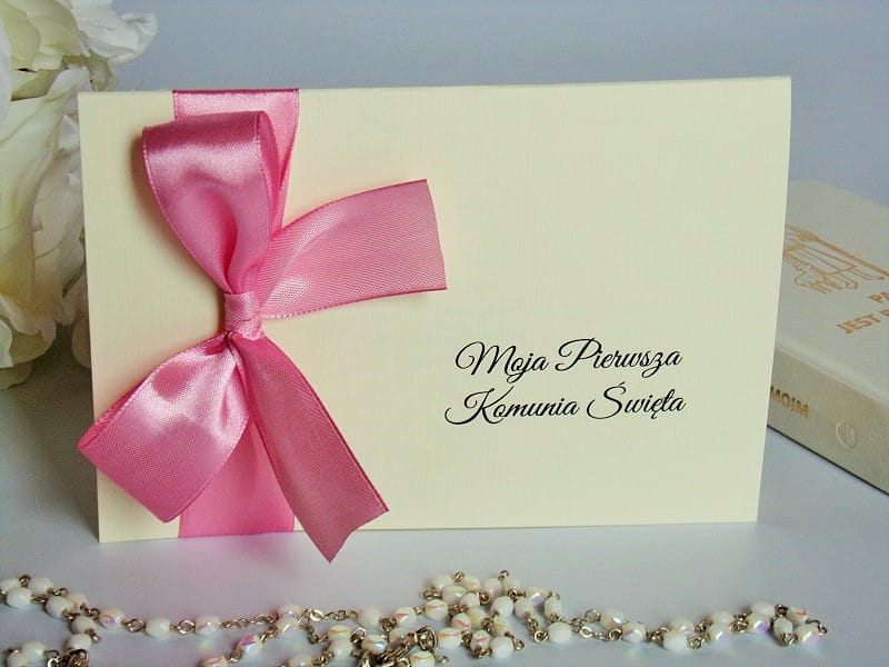 Zaproszenie na Pierwszą Komunię Świętą z kolorową kokardką.