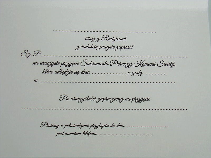 W środku zaproszenia wydrukowany jest gotowy tekst z wykropkowanymi miejscami do samodzielnego wypisania.
