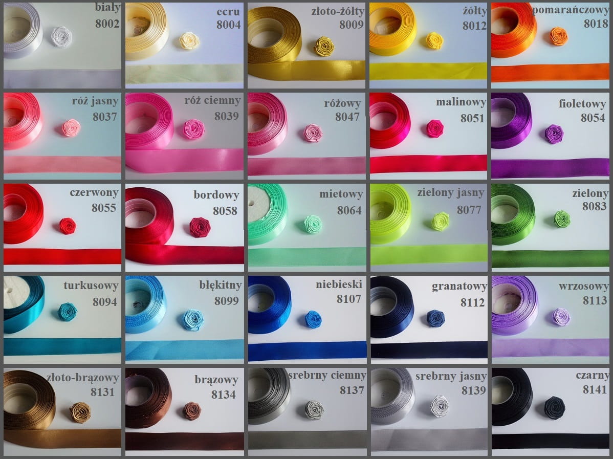 Po dokonaniu zakupu proszę o podanie koloru tasiemki, z jakiej mamy wykonać kokardkę. Dostępne kolory tasiemek na zdjęciu.